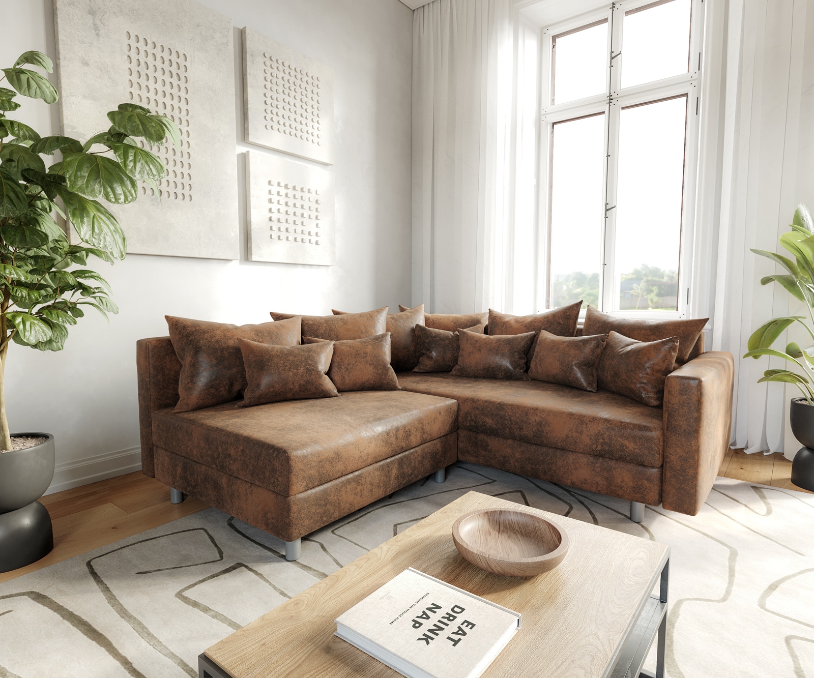 Mit der Eckcouch Clovis wird der Begriff Wohnkomfort neu definiert. Das raffinierte Ecksofa eröffnet variantenreiche Stellmöglichkeiten. Durch den modularen Aufbau lässt sich die Polsterecke mit weiteren Elementen flexibel kombinieren und beliebig erweitern. Von der gemütlichen Sitzecke im Wohnzimmer bis zur exquisiten Lounge mit einem imponierenden Platzangebot ist alles möglich. Clovis ist ganz einfach zu vergrößern – Für weitere Module kommen Sie einfach auf uns zuDa diese spezielle Couch individuell erweiterbar ist, fügt sie sich harmonisch in das moderne Ambiente ein und zeigt ein eindrucksvolles Design mit Loftcharakter. Jedes einzelne Element der modular zusammengestellten Polstergruppe lässt sich gegen ein größeres oder kleineres Modul austauschen.So verändert das Sofa seine Form und Größe nach Ihren individuellen Wünschen. Pflegeleichte Materialien und robuste Bezugsstoffe ergänzen die herausragende Funktionalität der wandlungsfähigen Eckcouch. Die gepolsterten Sitzflächen versprechen ein unvergleichliches Komfortgefühl.Maße ca.: B200 x T200 x H67 cmSitzhöhe: 40 cmSitztiefe (mit/ohne Kissen): 45/90 cm Material: Microvelours (100% Polyester) in Vintage OptikPolsterung: BonellfederkernFarbe: BraunOberfläche: Vintage OptikMontagehinweis: teilmontiert, die Verbinder der Einzelteile und die Füße müssen angeschraubt werdenGewicht in kg: 117Hinweis: inklusive 6 großer und 6 kleiner Kissen, die Armlehne kann sowohl rechts als auch links montiert werden, bei Bedarf kann diese auch erst zu einem späteren Zeitpunkt angebracht werden, die Ottomane befindet sich auf der rechten Seite in der Ansicht von vorne, Rücken echt bezogen,