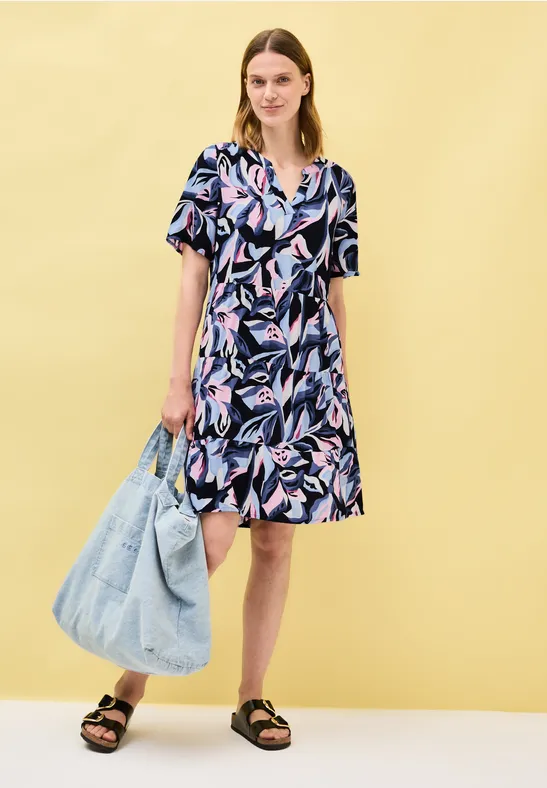 Das knielange Kleid von CECIL für Damen mit grafischem Muster und Volants ist ein echter Hingucker. Der geschlitzte Ausschnitt und die weiche Viskose machen es zum idealen Begleiter für warme Tage. Bequem, leicht und wunderbar kombinierbar.