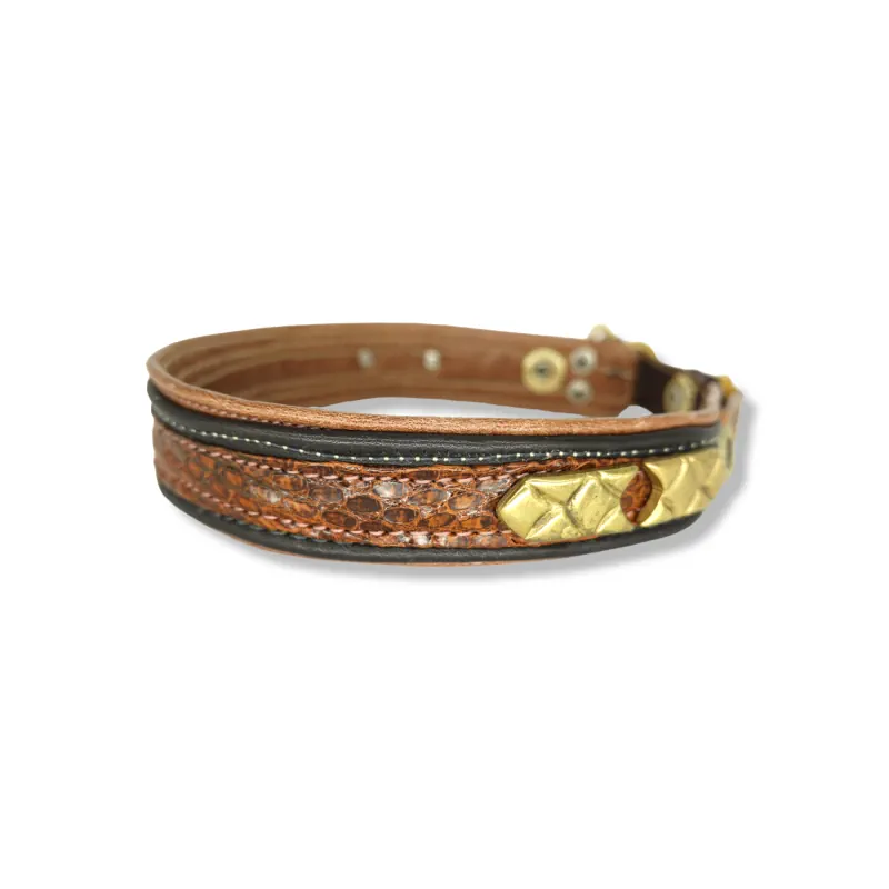 Das bellerei Halsband barna #37 besteht aus hochwertigem Leder. Die goldenen Nieten sowie die braunen Ledervarianten und die upcycelte Schlangenhaut verleihen dem Hundehalsband seinen einzigartigen Look. barna #37 ist an der schmalsten Stelle 2 und an der breitesten Stelle 3 cm breit, die Länge des Zugstopp-Halsbands beträgt zwischen 38 und 42 cm, bei einem Gesamtgewicht von 89 Gramm.