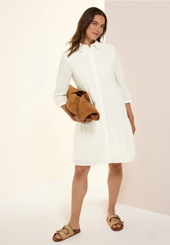 Das knielange Kleid von CECIL für Damen verzaubert mit modischer Lochstickerei und sommerlichen Volants. Der Hemdkragen und die 3/4-Ärmel setzen klassische Akzente. Die reine Baumwolle sorgt für ein angenehmes Tragegefühl.